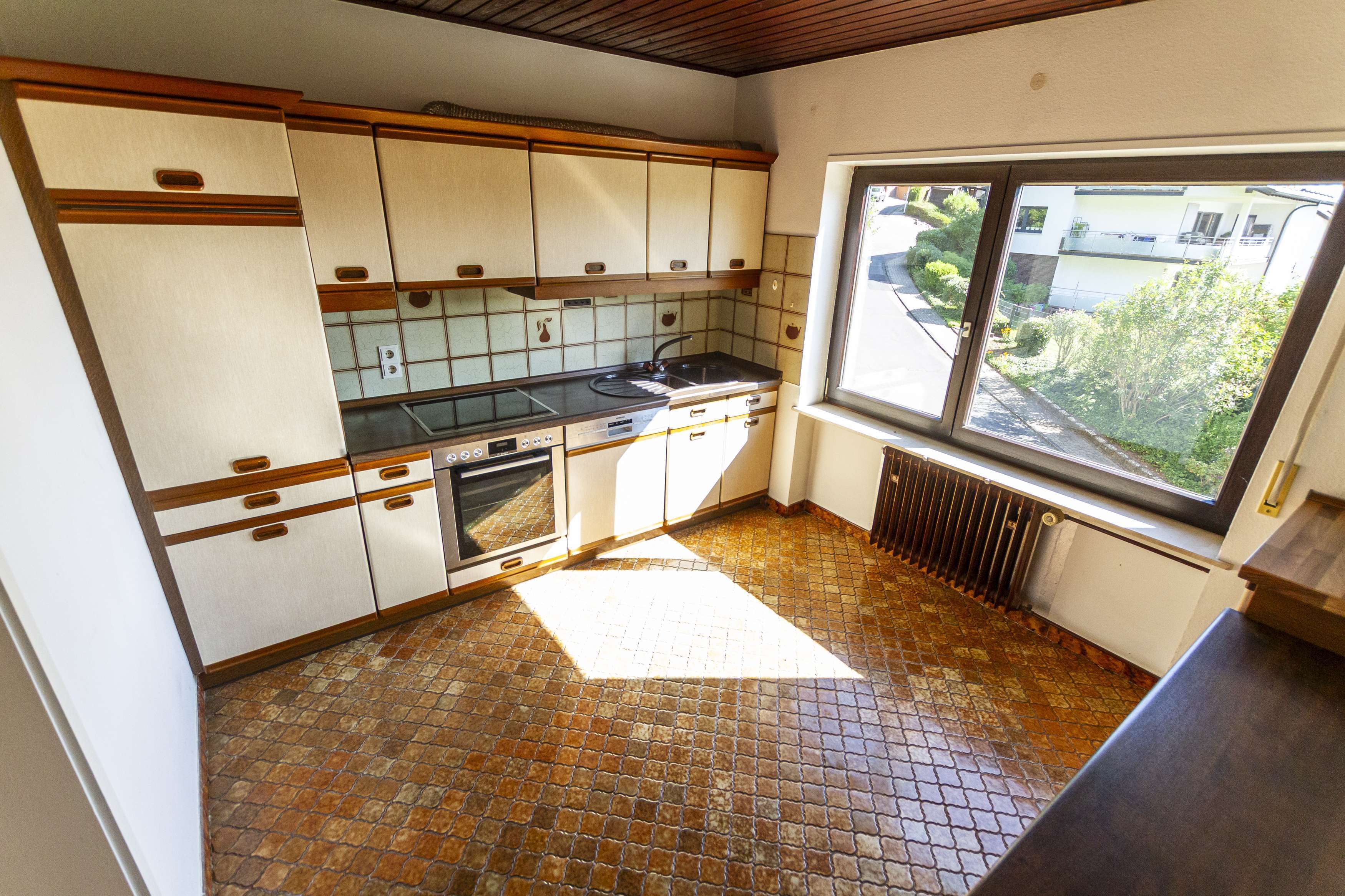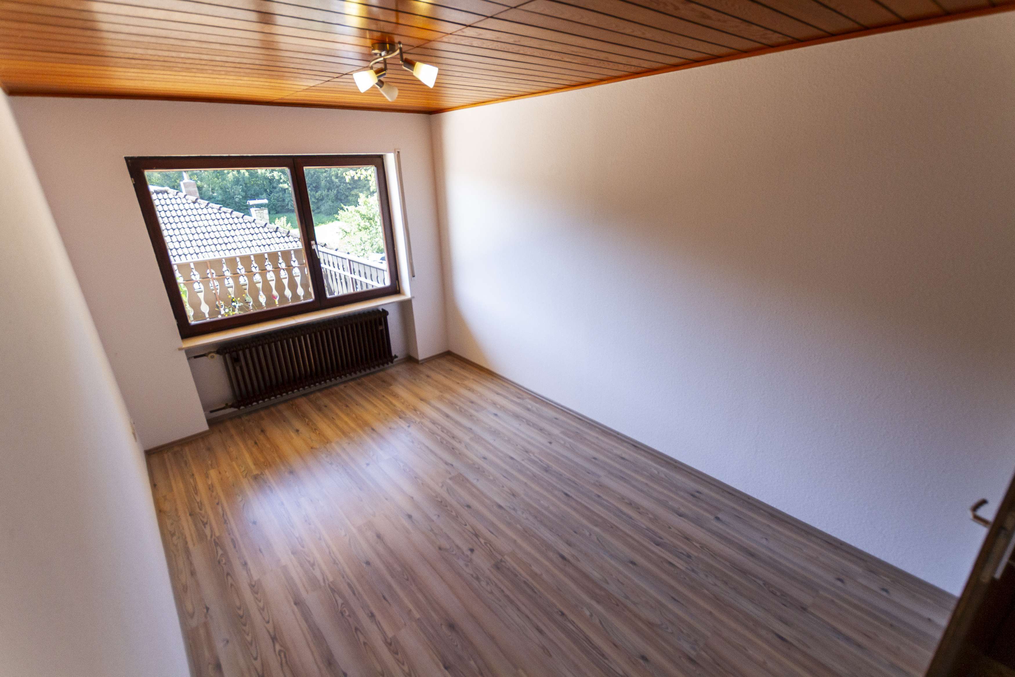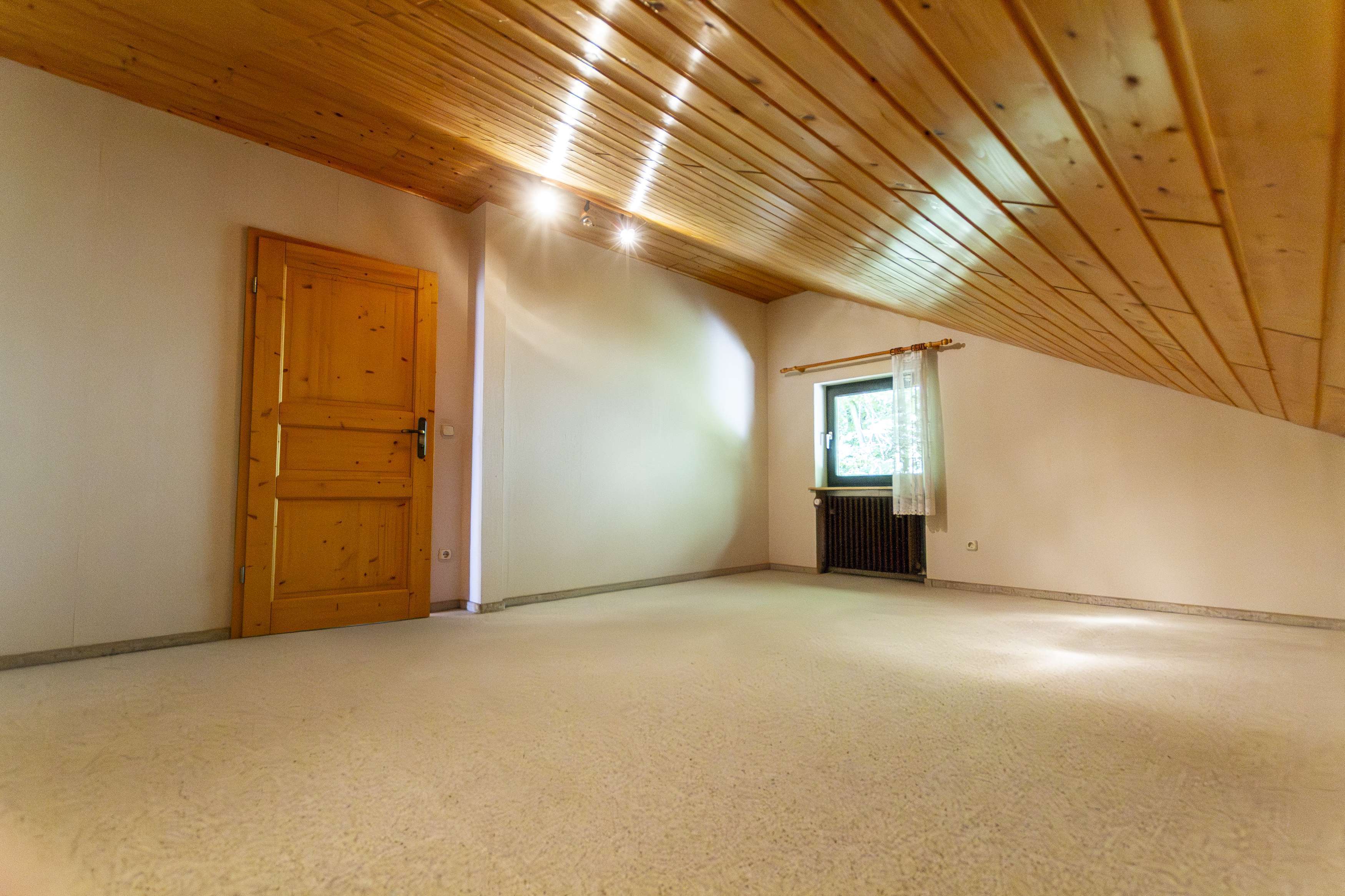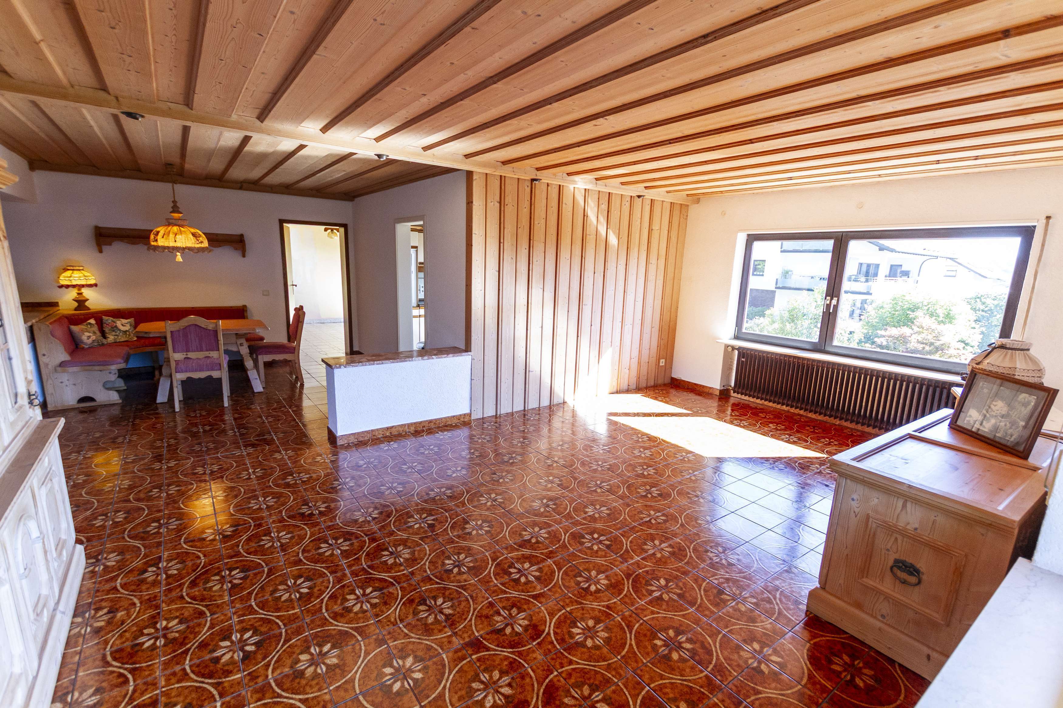 In nahezu allen Räumen befindet sich die für das Baujahr typische Naturholz-Deckenvertäfelung. Durch einen weißen Anstrich lässt sich diese optisch modernisieren und an heutige Wohnstandards anpassen.