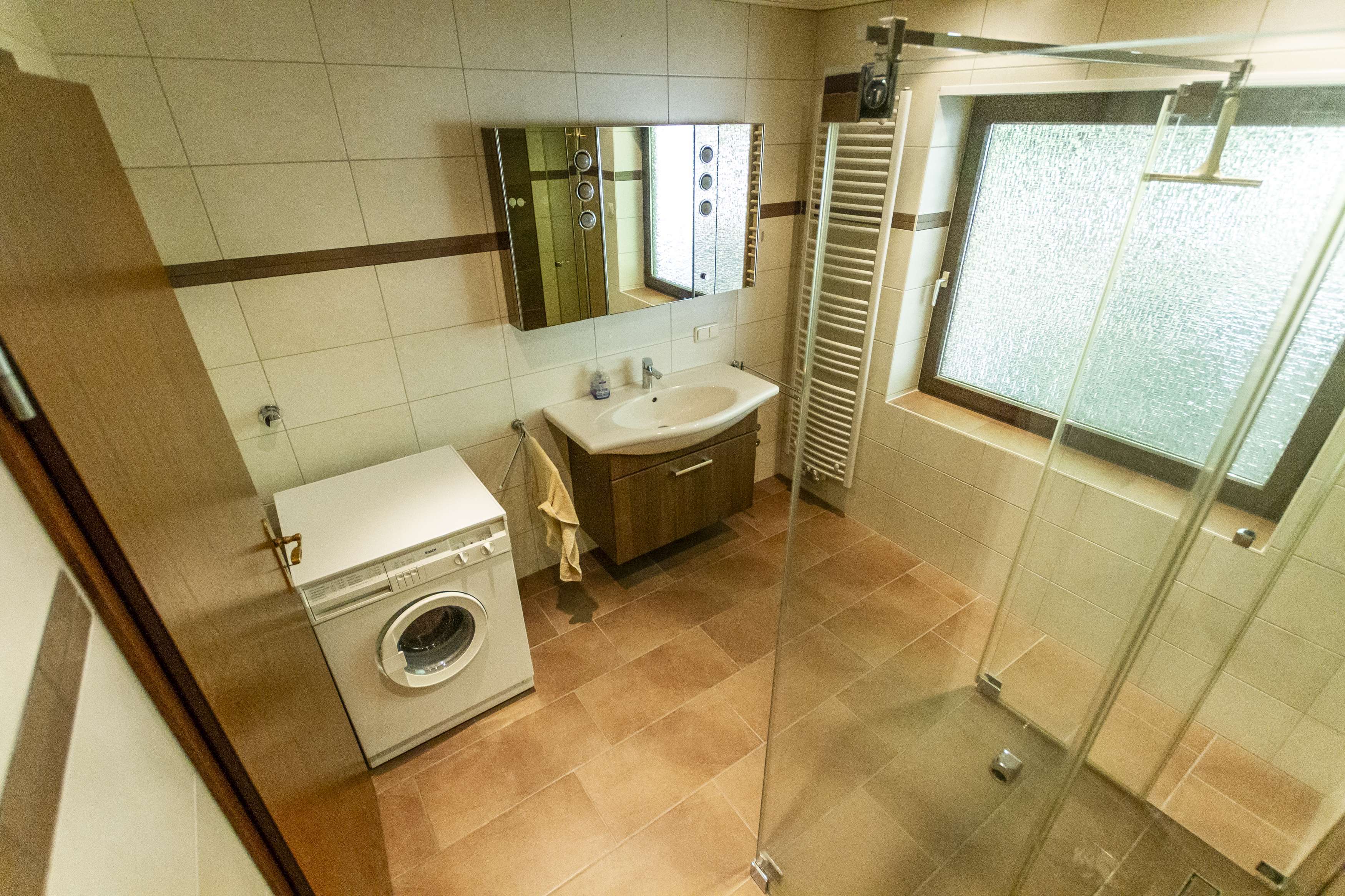 Neutrale Fliesen im DG, der in den Wohnräumen verlegte Teppichboden verlangt eine Renovierung.