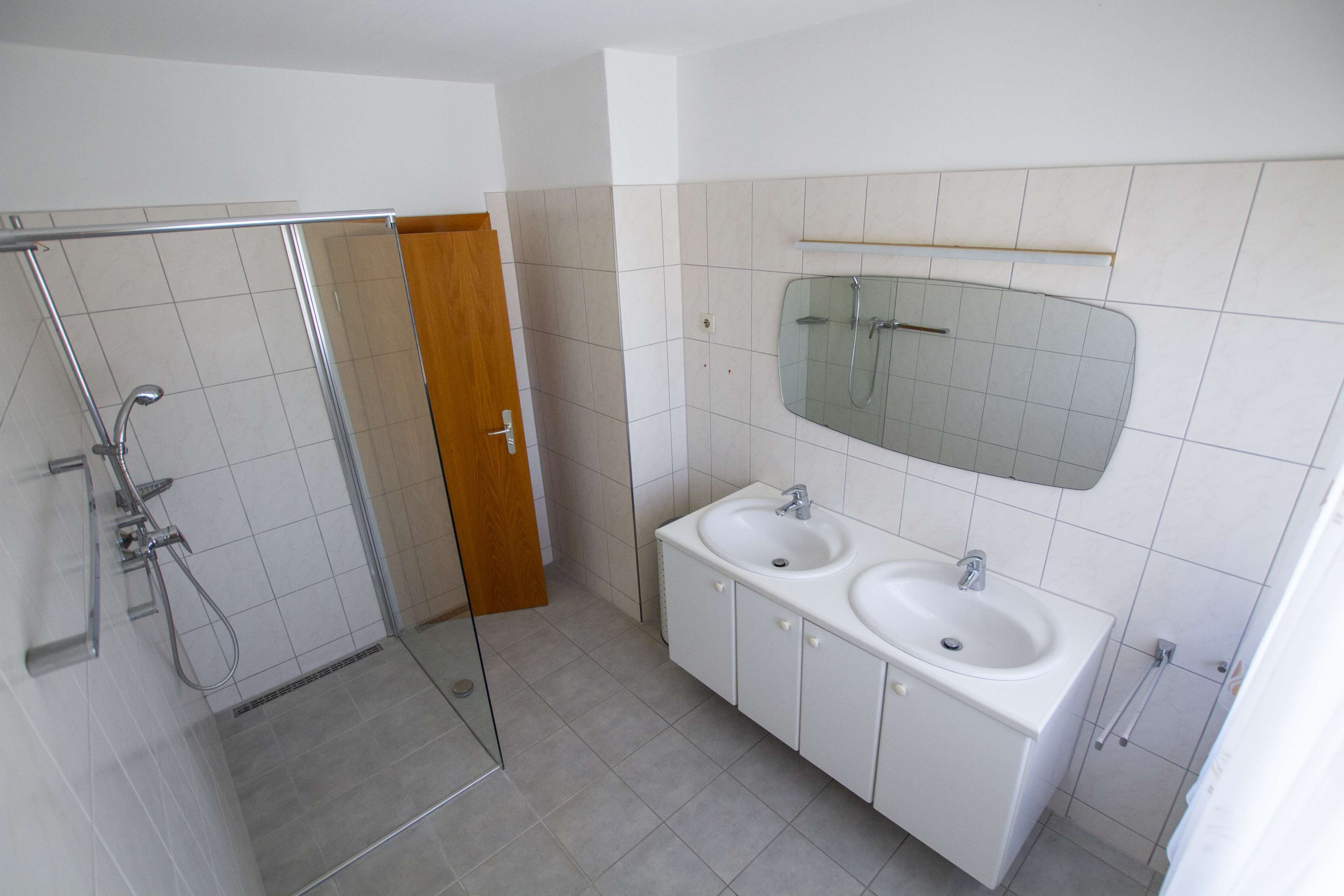 Das Badezimmer wurde im Rahmen der Sanierung des Erdgeschosses modernisiert. Es ist mit einer großen, barrierefreien Dusche ausgestattet und in ansprechender Farbgebung gestaltet. Es gibt ein vom Bad getrenntes WC.
